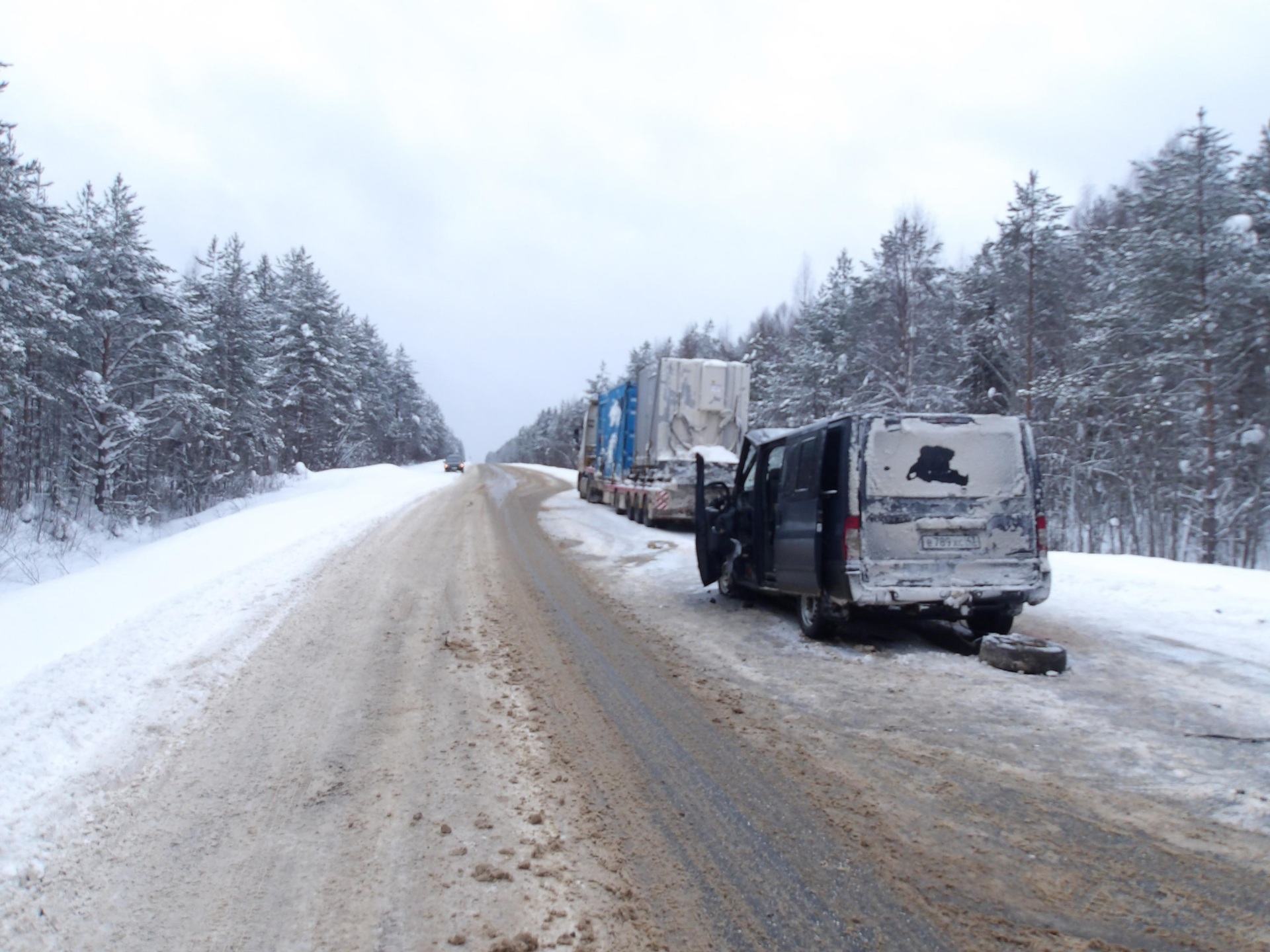 24 февраля в 8:00. Водитель Ford Tourneo 1981 г.р. двигался по дороге Чебоксары - Йошкар-Ола - Киров - Сыктывкар со стороны Сыктывкара в направлении Кирова. На 554-м км, уходя от столкновения с автомобилем Dongfeng (с автополуприцепом), который двигался впереди в попутном направлении, он выехал на встречную полосу и столкнулся со Scania с полуприцепом под управлением мужчины 1978 г.р. После этого Ford столкнулся с Dongfeng, от которого пытался уйти изначально впереди в попутном направлении.