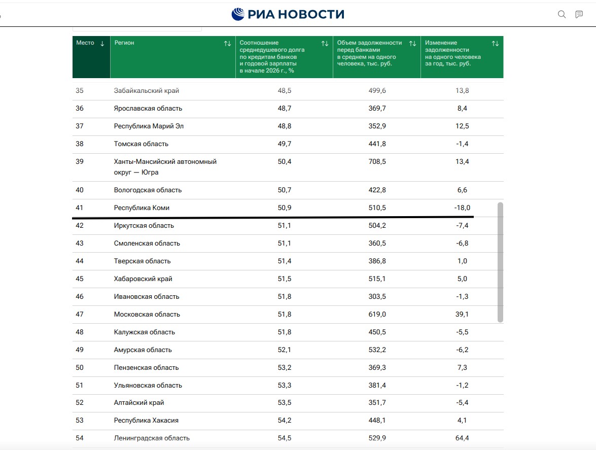 РИА Новости подготовили рейтинг регионов по закредитованности населения. По данным информагентства, соотношение среднедушевого долга по кредитам и годовой зарплате в регионе в начале 2026 года составляет 50,9%. Изменение задолженности на одного человека за год - 18 тыс. рублей.