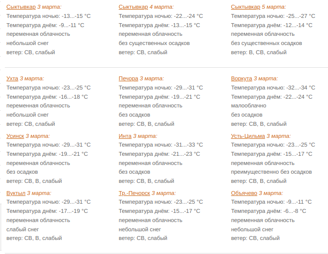 В Сыктывкаре 3 марта переменная облачность. Небольшой снег. Ветер северо-восточный 2-7 м/с. Температура ночью -13...-15°С, днем -9...-11°С.