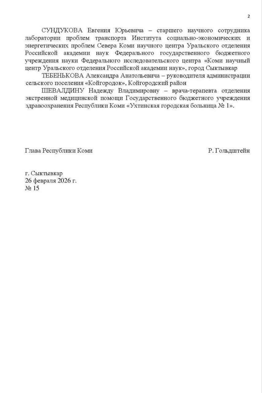 Отмечен труд учёного Евгения Сундукова из Коми научного центра, врача-терапевта из Ухты Надежды Шевалдиной, руководителя администрации сельского поселения "Койгородок" Александра Тебенькова, представителя общества "Динамо" Алексея Малкова, финансиста Ирины Кортышевой и кандидата исторических наук, доцента Ольги Кузивановой.