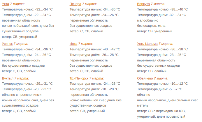 В субботу в северных районах переменная облачность. Без существенных осадков, в Воркутинском районе мгла. Ветер северный, северо-восточный 3-8 м/с. Температура ночью -29...-34°С, при прояснении -39...-44°С, днем-23...-28°С, на крайнем северо-востоке -30...-35°С.