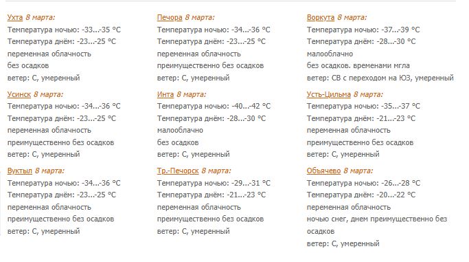 Ветер северный 3-8 м/с, на крайнем юге и юго-востоке 6-11 м/с. Температура ночью -32...-37°С, местами на севере -40...-45°С, в отдельных южных районах -26...-31°С; днем-20...-25°С, на крайнем северо-востоке -27...-32°С.