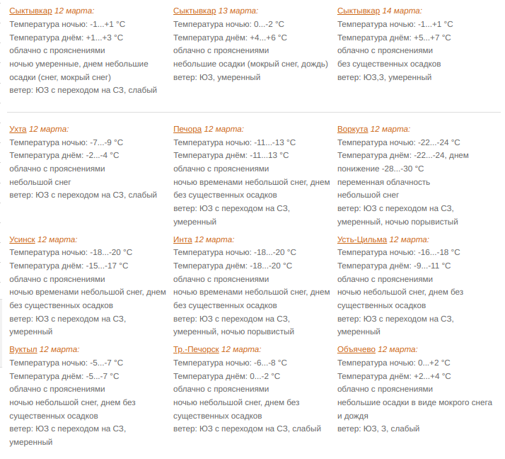 12 марта в Коми облачно с прояснениями, небольшие, ночью местами умеренные осадки (снег, мокрый снег).