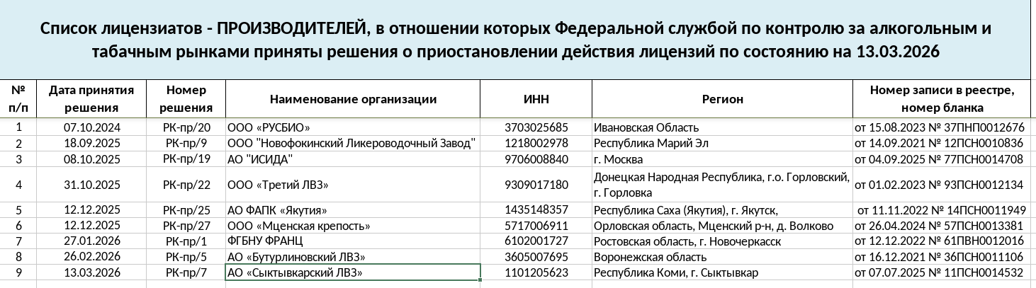 В списке лицензиатов-производителей, в отношении которых Федеральной службой по контролю за алкогольным и табачным рынками приняты решения о приостановлении действия лицензии на 13 марта, также числится Сыктывкарский ЛВЗ.