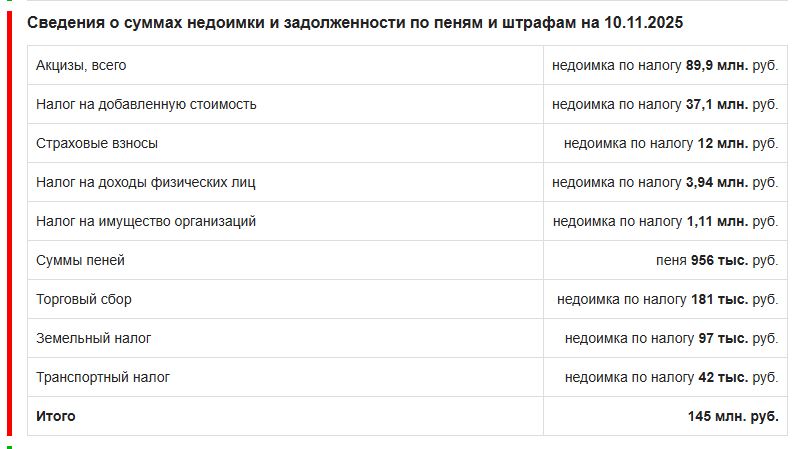 Как говорится на портале, ФНС предоставила сведения о налоговых задолженностях на 10 ноября 2025 года (без учета погашения на эту дату) на сумму 144,6 млн руб. На эту же дату сумма пеней составила 956,9 тыс. руб. ФНС предоставила информацию о приостановке операций по счетам на 16 марта 2026 года.