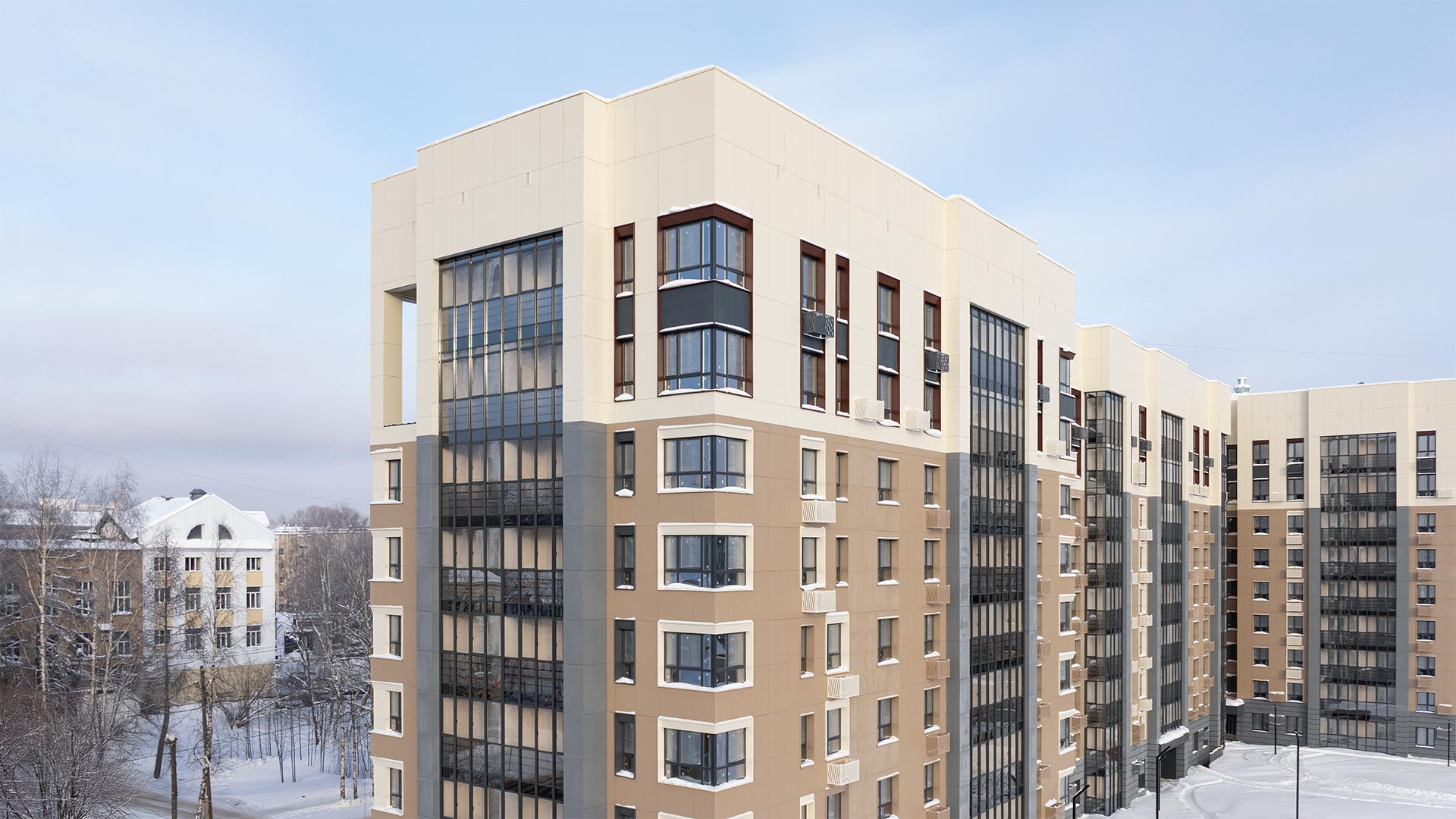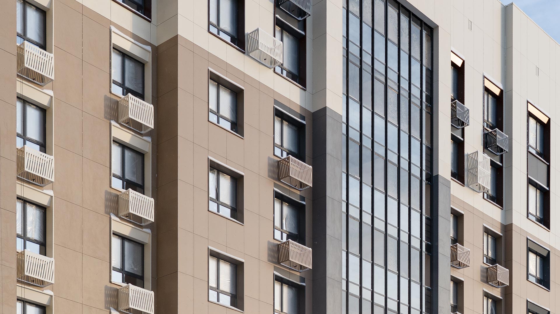 - Красивый дом всего на девять этажей. Фасад природных оттенков напоминает срез одноимённого камня.Чтобы сохранить его внешний вид, СКАТ разместил на стенах корзины для кондиционеров.