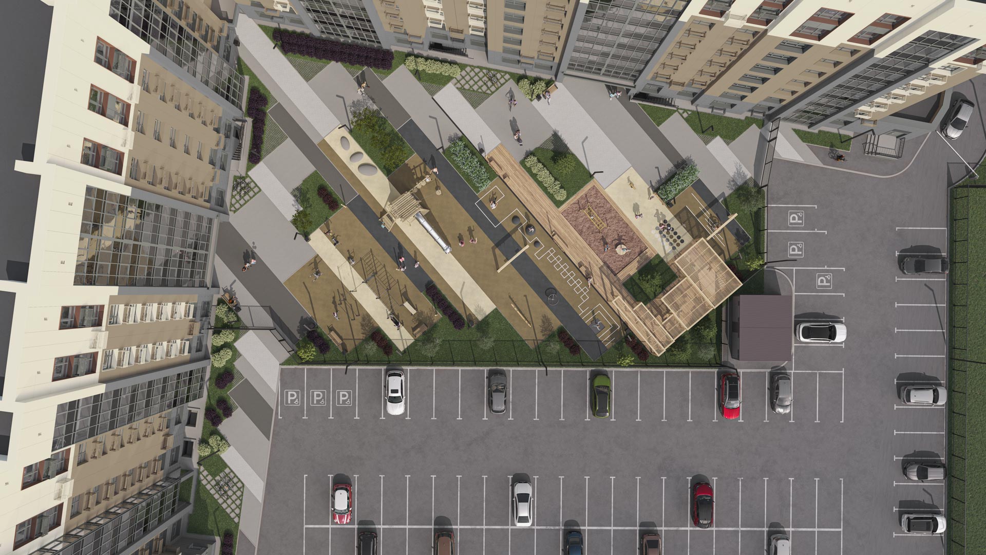 - Двор на закрытой забором территории и вынесенная за его пределы парковка.