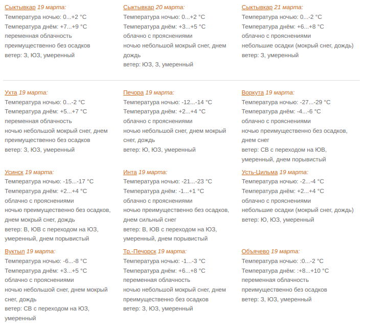 В северных районах облачно с прояснениями. Ночью небольшой снег, на крайнем северо-востоке преимущественно без осадков, днем осадки в виде снега, мокрого снега и дождя, на крайнем северо-востоке сильный снег. Утром и днем местами гололед. Ветер восточный, юго-восточный с переходом на юго-западный, западный 6-11 м/с, днем в отдельных районах порывами до 14 м/с, на крайнем северо-востоке порывы до 15-18 м/с, метель. Температура ночью -3...-8°С, на северо-востоке при прояснении -13...-18°С, на крайнем северо-востоке -24...-29°С; днем 0...+5°С, в Воркутинском районе -5...-10°С.