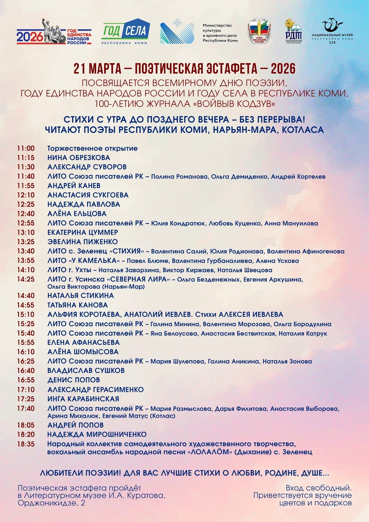 21 марта, во Всемирный день поэзии, в 11:00 в сыктывкарском Литературном музее И.А. Куратова состоится XXI Республиканская поэтическая эстафета. Мероприятие приурочено к Году единства народов России и 100-летию литературного журнала "Войвыв кодзув" (Северная звезда), сообщает медиацентр Минкультуры РК.