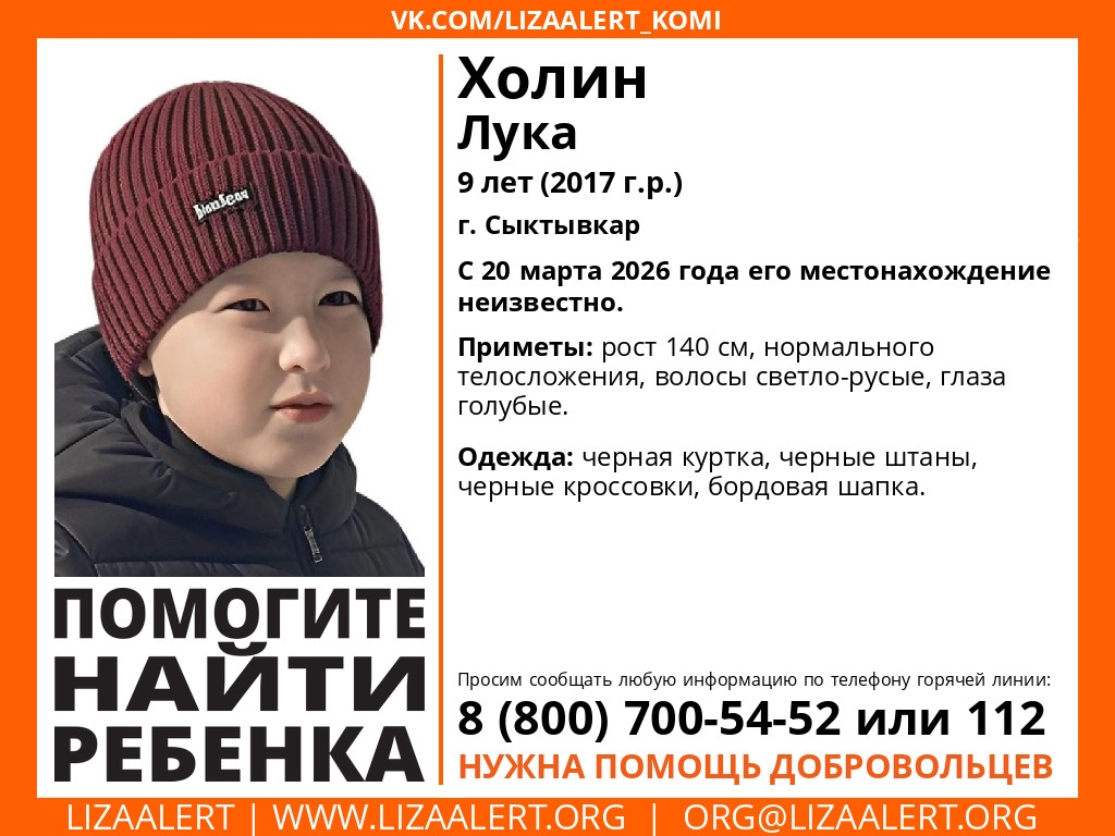 Как сообщает поисковый отряд "ЛизаАлерт", разыскивается 9-летний Лука Холин.