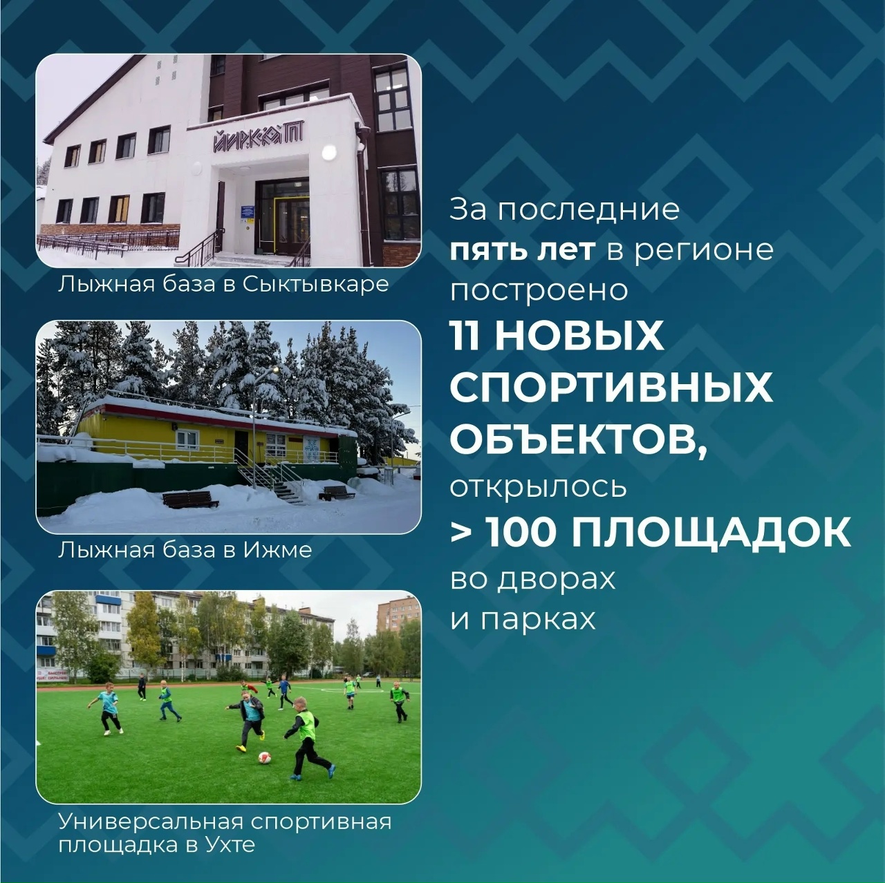 По словам руководителя региона, за последние пять лет в Коми была проведена работа по укреплению спортивной инфраструктуры. За этот период в городах и районах возвели 11 новых крупных спортобъектов, открыли более сотни площадок во дворах и парках, а также капитально отремонтировали существующие залы.
