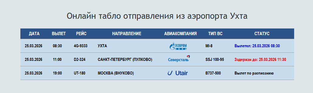 Из Ухты задерживается рейс компании "Северсталь". Вылет, назначенный на 11:00, перенесен на 11:30. Рейс компании Utair, следующий до Москвы, должен вылететь согласно расписанию.