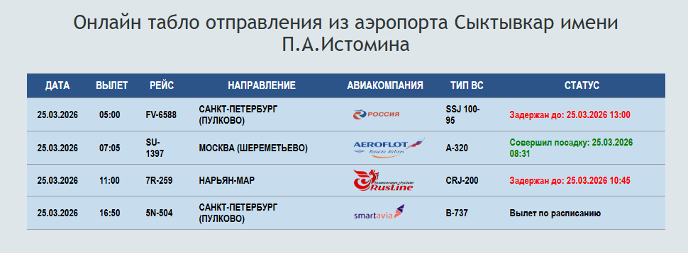 Два рейса из Сыктывкара и Ухты в Санкт-Петербург задерживаются.