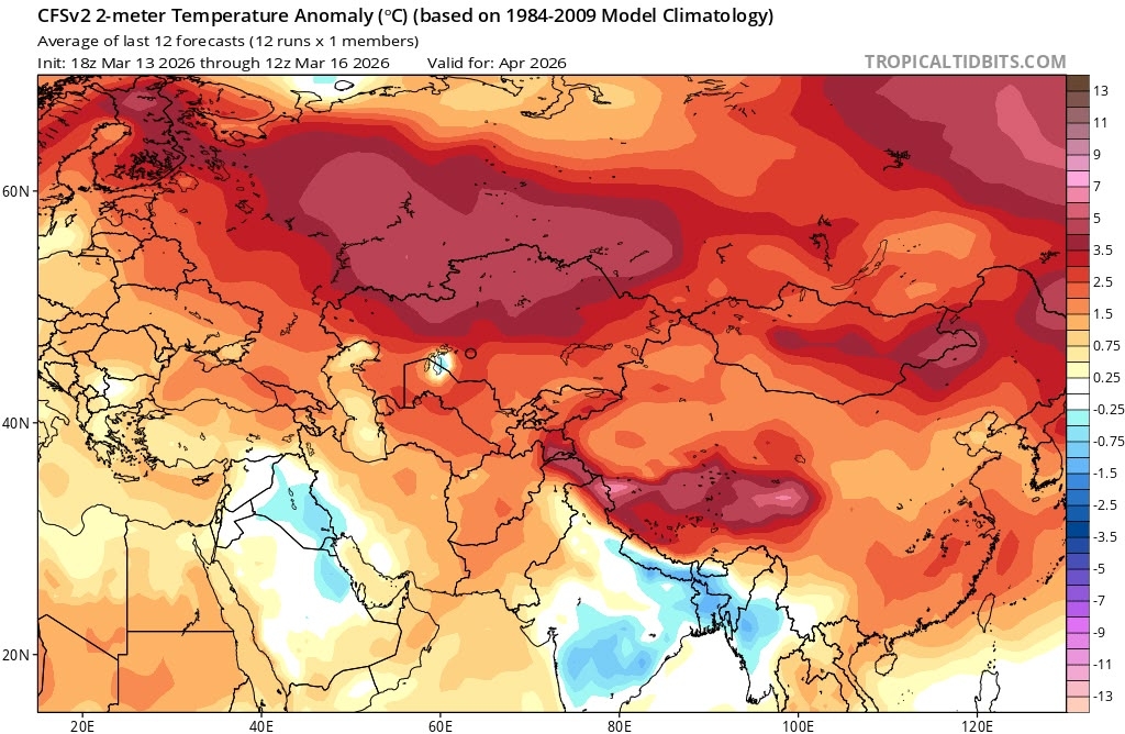 В начале апреля антициклоны немного отступят и на место них придут Атлантические циклоны, неся осадки, тёплый и влажный воздух из Средней Азии в тёплых секторах. Температура воздуха будет колебаться от +5°С до +12°С, а при прохождении фронтов не исключены и первые грозы. На всей территории температура будет вновь выше климатической нормы от 8 до 10 градусов.