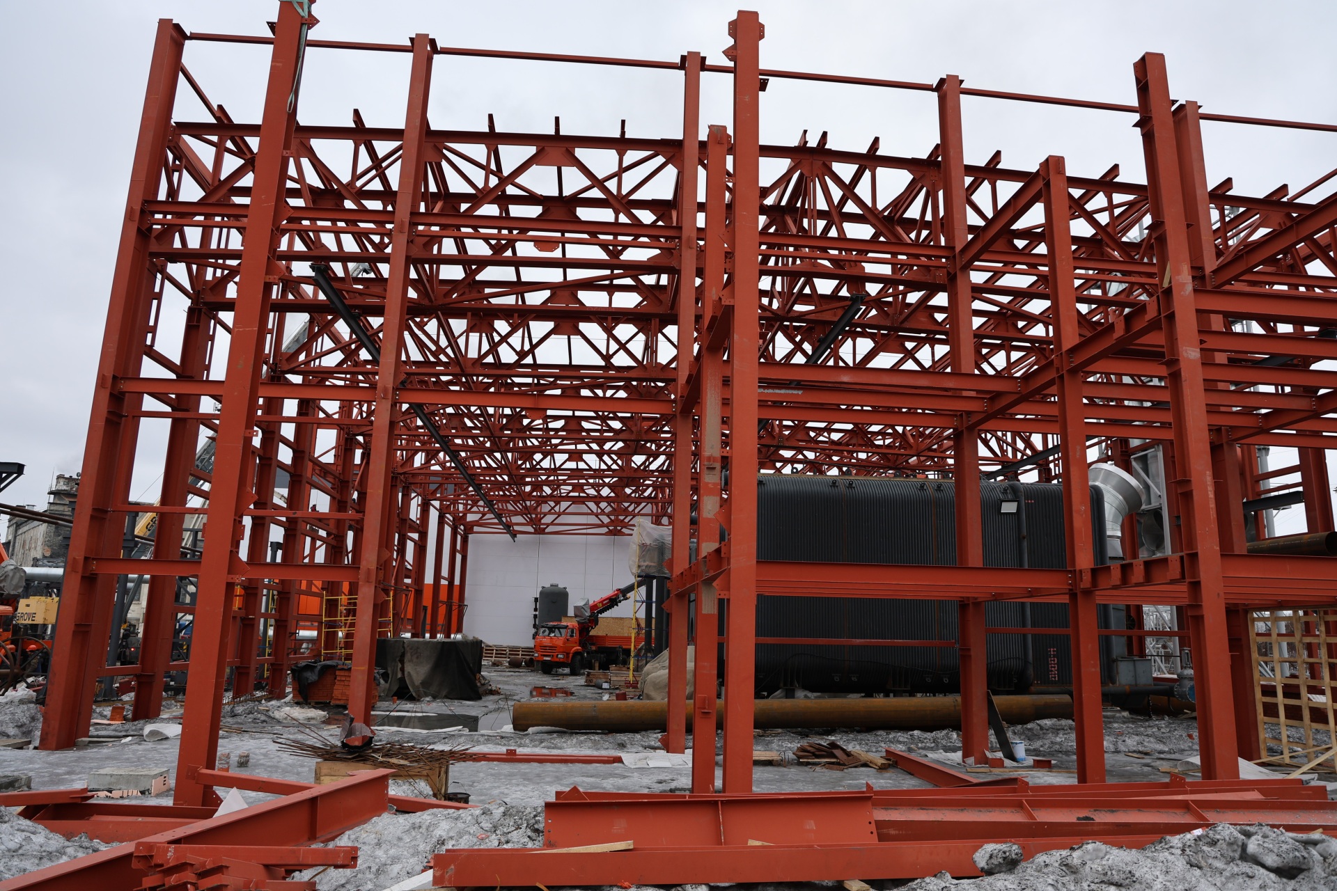 Завершается строительство здания водоподготовительной установки, которая обеспечит соответствие качества горячей воды санитарным нормам. Сюда уже подали тепло, корпус обшивают сэндвич-панелями, проводятся работы по сборке оборудования для очистки воды. Близится к завершению монтаж баков коагулированной, декарбонизированной, осветлённой воды, на апрель запланированы их гидравлические испытания.
