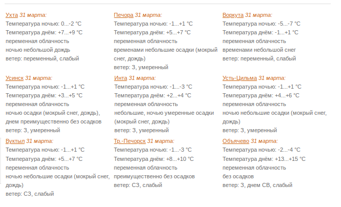 В северных районах ночью небольшие, местами умеренные осадки, днем местами небольшие осадки (мокрый снег, дождь). В Воркутинском районе ночью туман. Ветер западный 5-10 м/с. Температура ночью -4...+1°С, днем +3...+8°С, на крайнем северо-востоке ночью -3...-8°С, днем -2...+3°С.