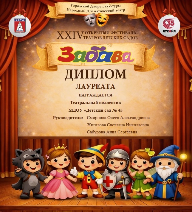 Традиционный городской открытый фестиваль театров детских садов города Ухты "ЗАБАВА" проходит ежегодно в рамках проекта "Театр на пороге ХХI века" по программе "Создание детского театра на базе Народного драматического театра ГДК".