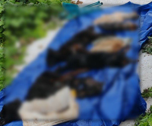 Однако на следующий день, уже 25 июня, когда волонтеры посещали место вместе с сотрудниками полиции, на передержке стоял громкий лай, а Усатовой не было на месте. Пройдя вглубь участка, полиция и волонтеры обнаружили выкошенный борщевик, среди которого местами сидели собаки на цепи. По территории гуляла непривязанная коза, грязная и худая. Свидетель выразила догадку, что коза могла принадлежать соседям Усатовой. Кругом были пустые миски, в которых не было еды и воды, сломанный мангал, пластмассовые ведра, рядом лежали ящики с поводками, шлейками и ошейниками. Также на участке валялись мешки с лошадиными копытами, виднелись отделенные от тела головы животных. Вдобавок ко всему на территории передержки стоял отвратительный тухлый запах, из-за которого даже было предложено провести анализ почвы.
