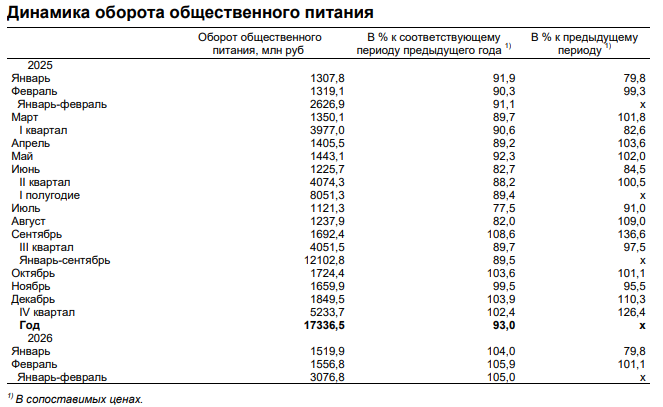 Особенно заметен отрыв от кризисных показателей годичной давности: в феврале прошлого года оборот составлял 1,319 млрд рублей, а рост в 2026-м (105,9%) сменил падение 2025-го (90,3%).