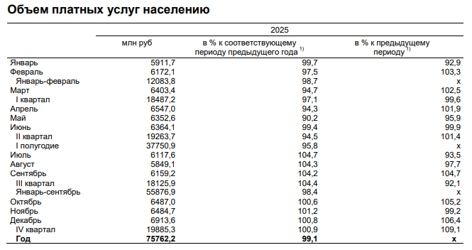 В структуре платных услуг традиционно доминируют коммунальные платежи (33,1% от общего объема), а также бытовые, телекоммуникационные и жилищные услуги. При этом выросли только отдельные категории: телекоммуникационные услуги прибавили 9,3%, услуги учреждений культуры - 6,4%, а бытовые услуги показали символический рост в 0,9%.