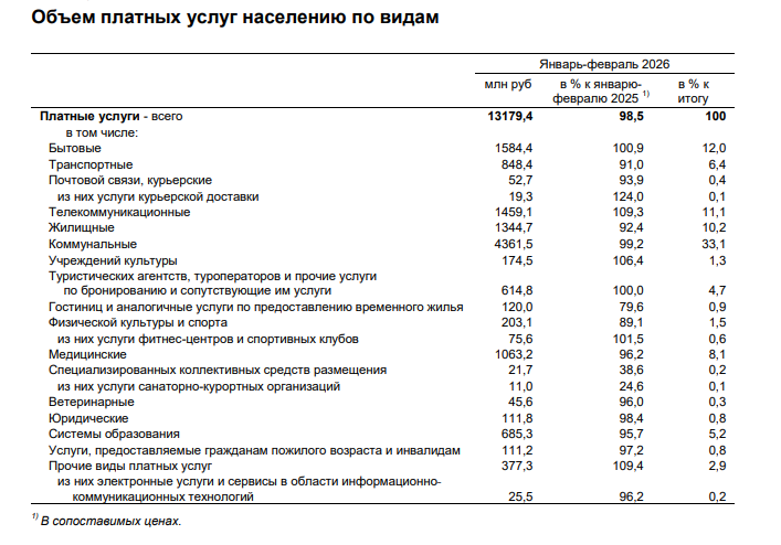 В отличие от сегмента общепита, общий объем платных услуг населению Коми продолжает сокращаться. В феврале 2026 года жителям республики было оказано услуг на 6,8 миллиарда рублей, что на 1,8% ниже показателей февраля 2025-го. За два месяца года спад составил 1,5% (98,5% к уровню прошлого года).