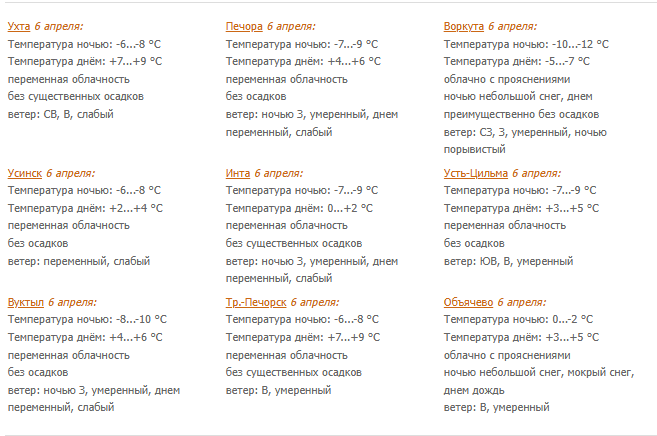 Местами небольшие осадки в виде мокрого снега и дождя. Ветер ночью переменный 1-5 м/с, на крайнем северо-востоке западный 7-12 м/с, в Воркутинском районе порывами 15-18 м/с, днем восточной четверти 4-9 м/с.