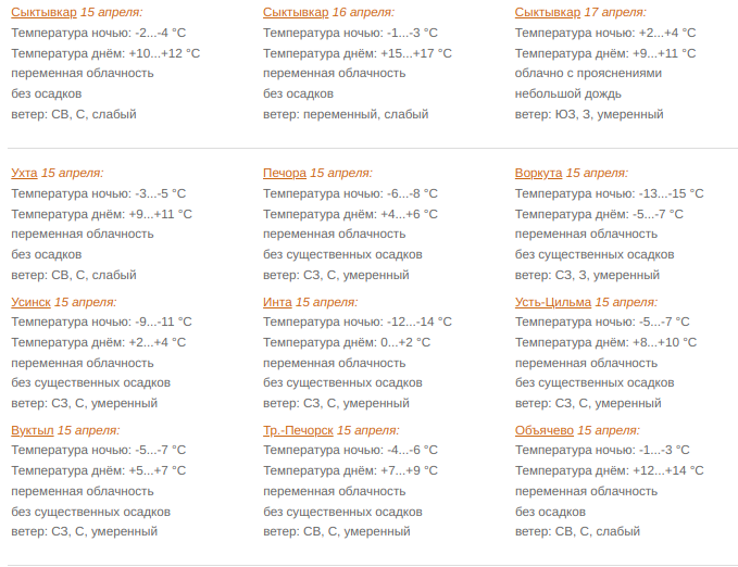 В Сыктывкаре 15 апреля переменная облачность. Без осадков. Ветер северо-восточный, северный 1-6 м/с. Температура ночью -2...-4°С, днем +10...+12°С.