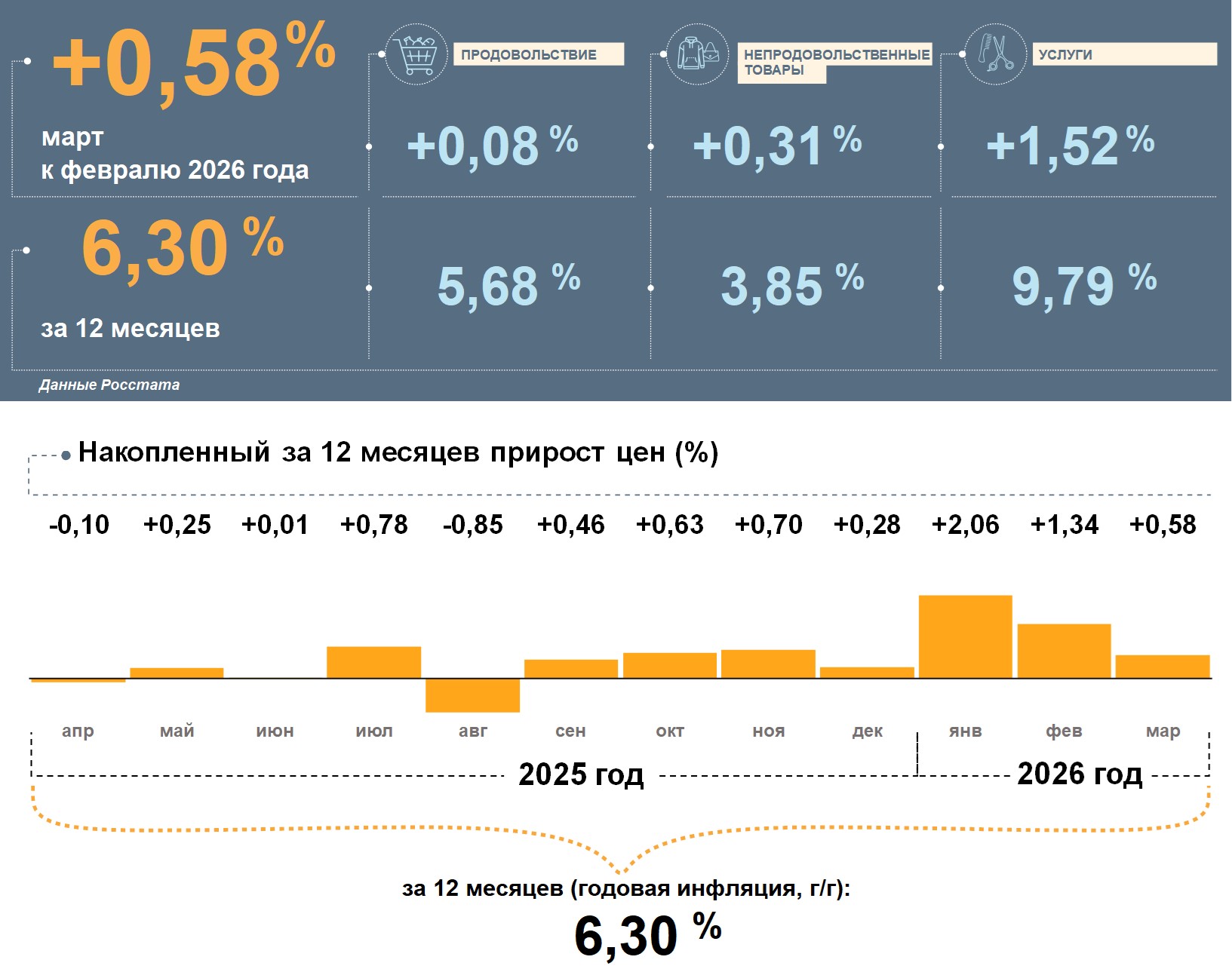 В марте цены в Республике Коми выросли на 0,6% по сравнению с февралем. При этом годовая инфляция в регионе замедлилась до 6,3%. Подробный обзор факторов – в информационно-аналитическом материале Банка России.