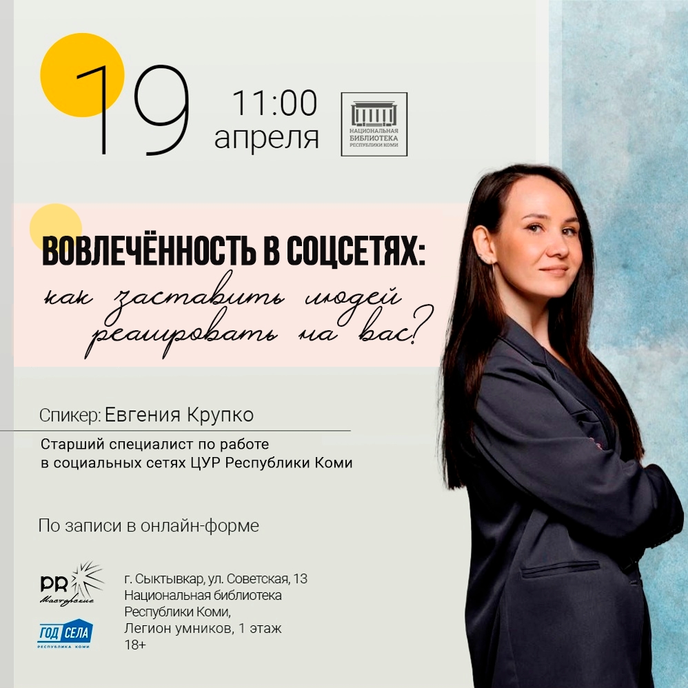 Национальная библиотека Республики Коми в 11:00 организует лекцию "вовлеченность в социальных сетях: как заставить людей реагировать на вас?" (18+), в 13:00 мастер-класс по изготовлению броши "Птица" (6+), а в 14:00 воскресную православную беседу на тему книги Есфири (12+).