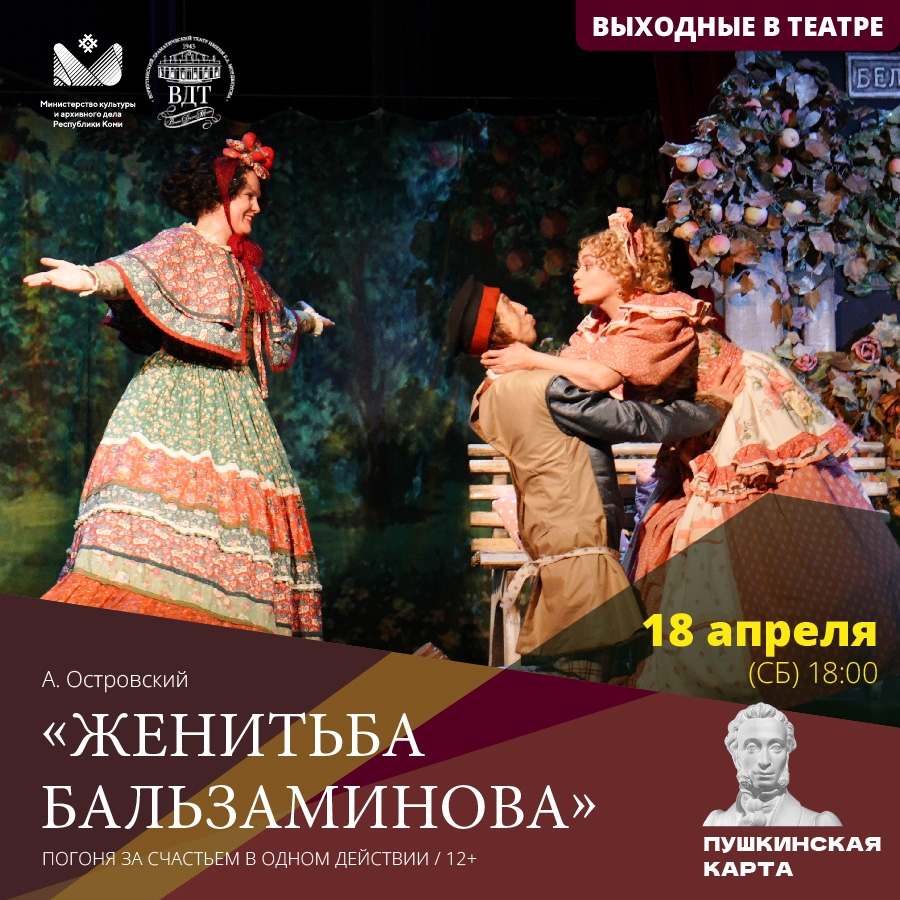 Воркутинский драматический театр им. Б.А. Мордвинова в 18:00 покажет постановку "Женитьба Бальзаминова" (12+).