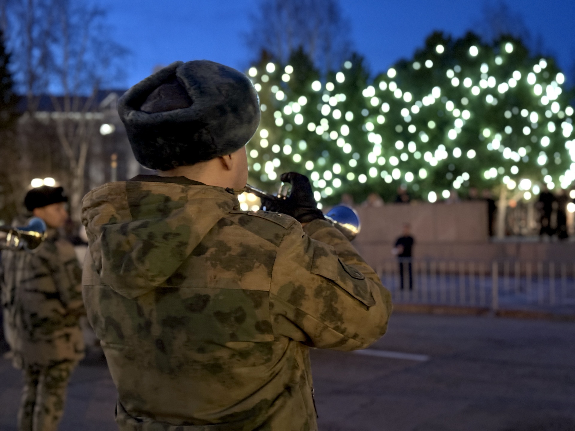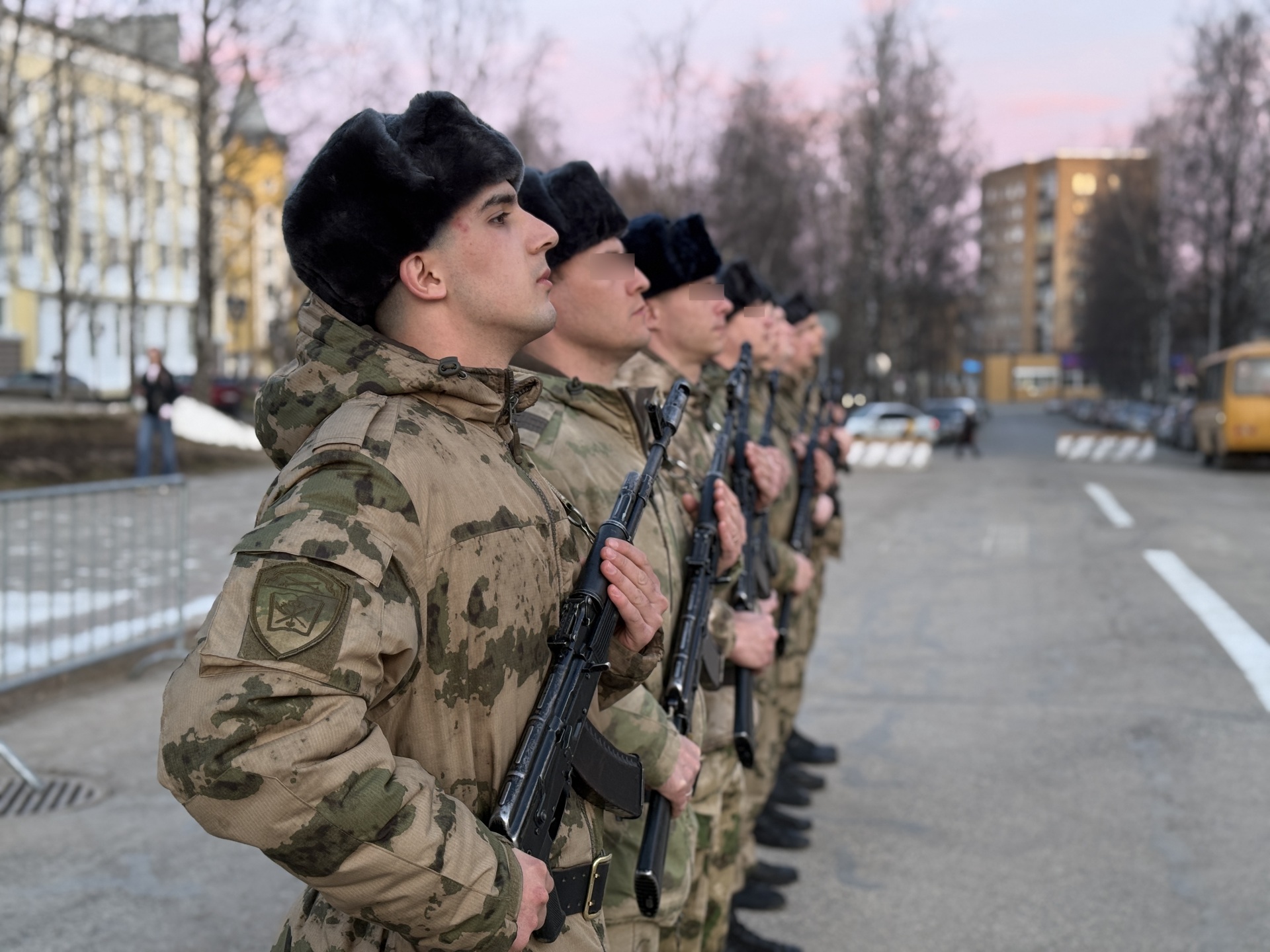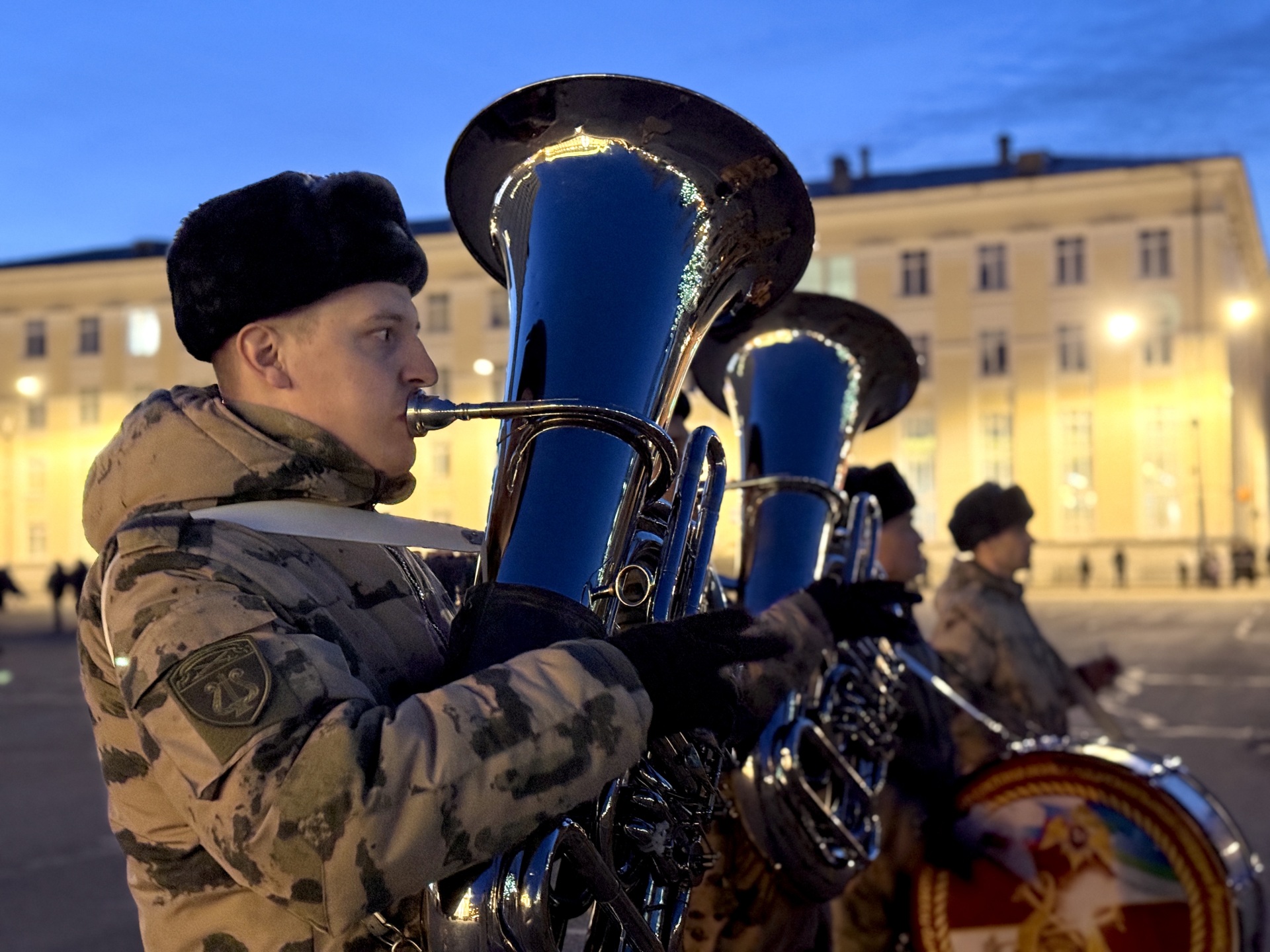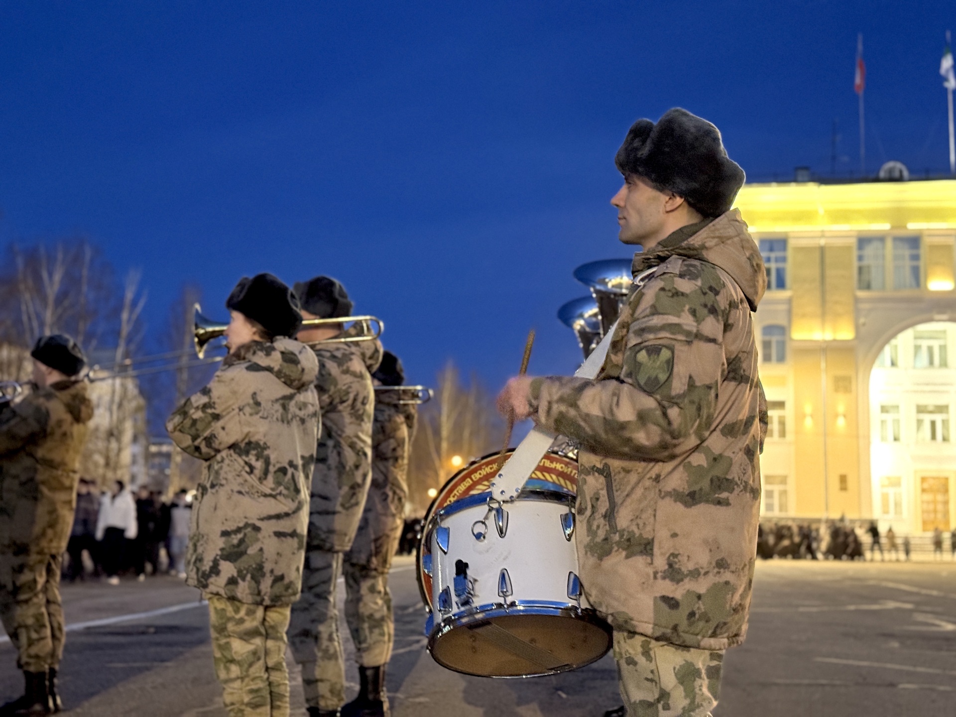 Под звуки военного оркестра росгвардейцы отрабатывают слаженность действий: в строю – знамённая группа, парадный расчёт и линейные, обеспечивающие чёткость построения.