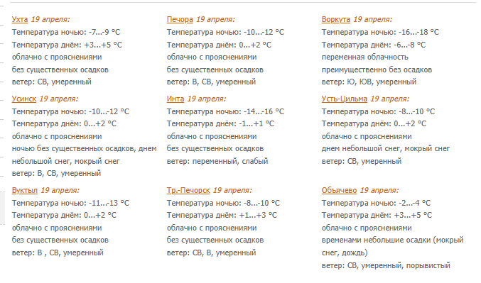 Местами небольшие осадки (снег, мокрый снег, дождь). Ветер северо-восточный, восточный 4-9 м/с, в отдельных южных районах порывами до 14 м/с, на крайнем северо-востоке южный, юго-восточный 3-8 м/с. Температура ночью -3...-8°С, при прояснении -9...-14°С, днем -1...+4°С, в южных районах до +8°С; в Воркутинском районе ночью -15...-20°С, днем -5...-10°С.