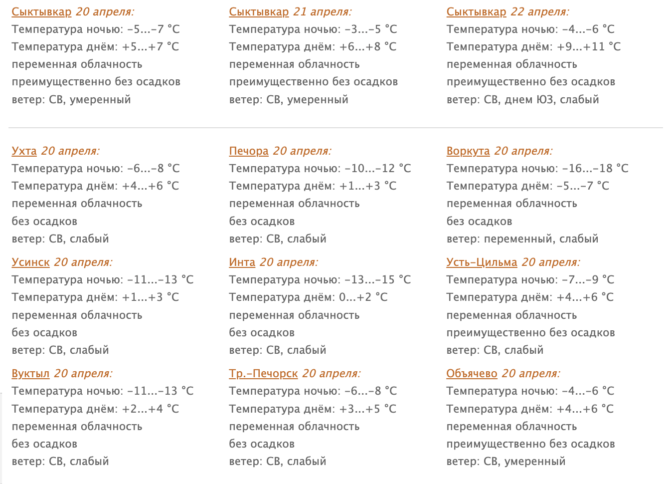 20 апреля в Коми переменная облачность. Преимущественно без осадков. Ветер северо-восточный 1-6 м/с, на крайнем юге 6-11 м/с.