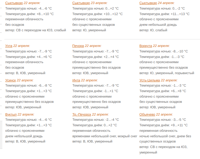 В Сыктывкаре 22 апреля переменная облачность. Без осадков. Ветер северо-восточный с переходом на юго-западный 2-7 м/с. Температура ночью -4...-6°С, днем +8...+10°С.