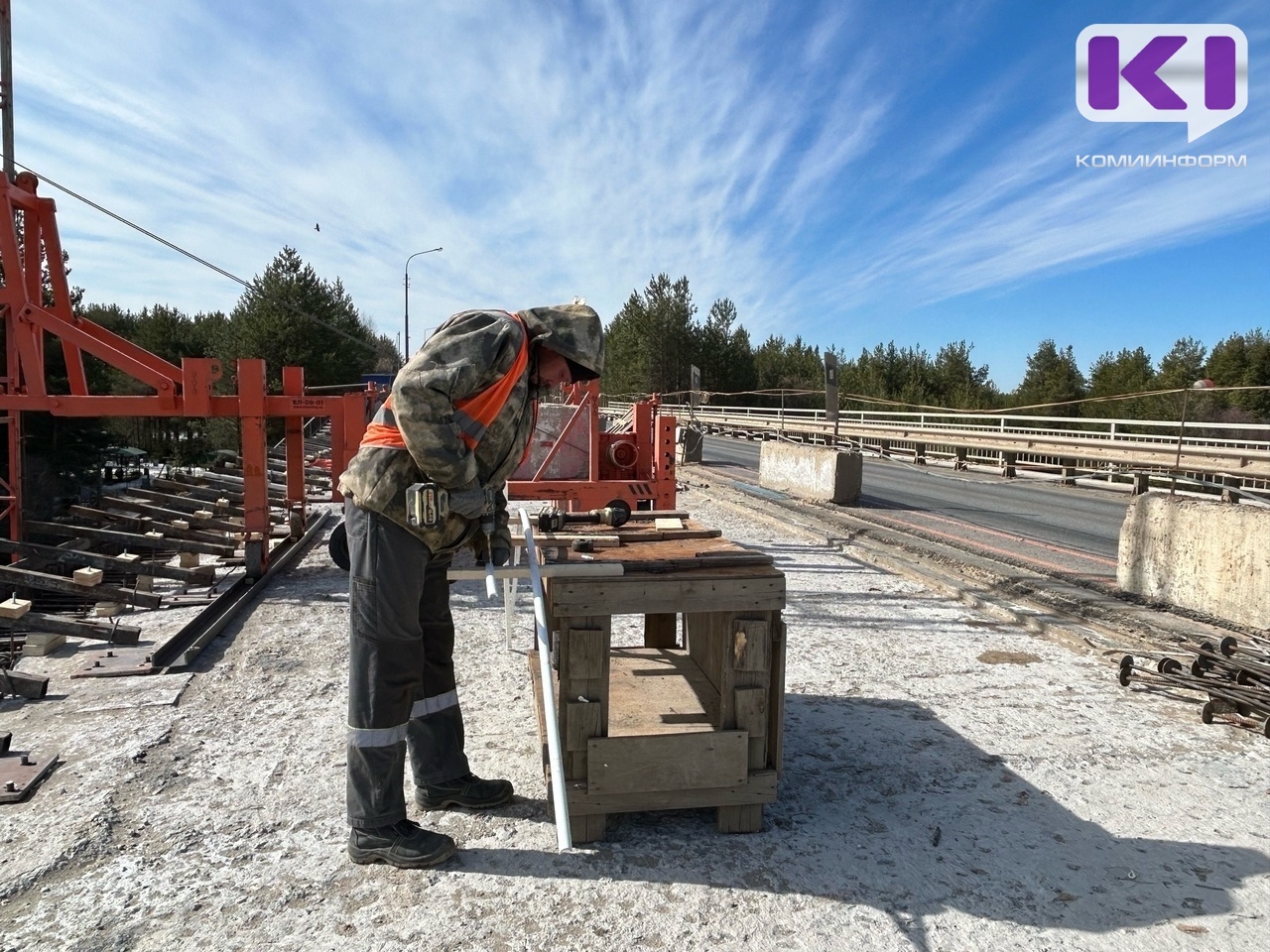 Контракт с новой подрядной организацией - ООО "СеверРегионСтрой" из Сыктывкара - заключили в первой половине 2025 года. Сейчас начались работы на правой половине проезжей части моста - на 47-м километре дороги "Сыктывкар-Троицко-Печорск". В частности, работники подрядной организации выполняют комплекс строительно-монтажных работ, например, армирование и монтаж бордюров.