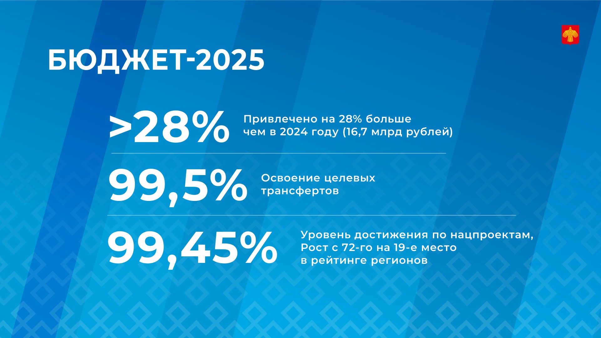 Что касается нацпроектов, отметил Д.Братыненко, достигнут рекордный результат: уровень достижения 99,45%, подъём с 72-го 2024 года на 19-е место в рейтинге регионов. Семь направлений - здравоохранение, безопасность дорожного движения, демография - остаются точками роста и приоритетными направлениями работы.