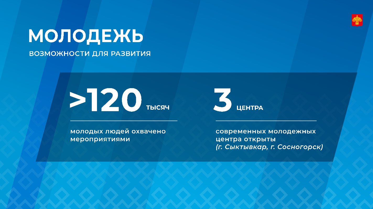 Выплачено 35 премий Правительства Республики Коми для талантливой молодёжи. Для более чем 120 тысяч молодых людей проведены уникальные региональные мероприятия. Это первый цифровой фестиваль ("Game-It"), открывший двери в мир информационных технологий, впервые республика стала регион-партнером Фестиваля молодого искусства "Таврида.Арт", а Международный фестиваль "Магия Севера" подарил участникам возможности для диалога с миром.