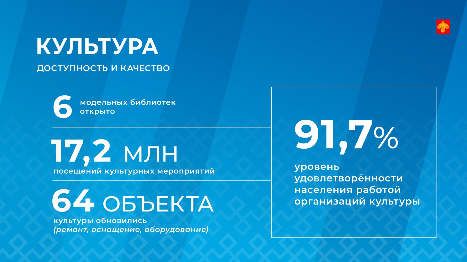 "Чтобы для каждого жителя нашей республики культурные ценности были доступными, в малых населённых пунктах открыты шесть модельных библиотек и четыре кинозала, усовершенствованы все профессиональные театры за счёт создания новых постановок и улучшения технического оснащения, а четыре детские школы искусств и Колледж искусств получили новые музыкальными инструментами, оборудованием и учебно-методическим пособием. Кроме того, в рамках народных проектов материальную базу укрепили 26 учреждений культуры в 17 муниципалитетах", - отметил Д.Братыненко.
