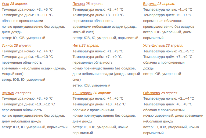 Во вторник будет облачно с прояснениями. Небольшие, местами умеренные осадки (дождь, мокрый снег). На крайнем северо-востоке, ночью на востоке центральных районов преимущественно без осадков. Ветер юго-восточный, южный 7-12 м/с, местами порывами 15-18 м/с. Температура ночью +1...+6°С, в Воркутинском районе -2...-7 °С, днем +6...+11°С.