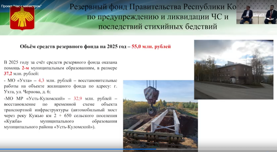 В 2025 фонд он достиг 55 млн руб. Средствами фонда воспользовались два муниципалитета. В Усть-Куломском районе потребовалось восстановить мост через реку Кужъю. На эти цели потратили 33 млн руб. старый мост через Кужъю пришёл в аварийное состояние и из-за угрозы обрушения был закрыт для движения транспорта в октябре 2024 года. Соседние населённые пункты оказались отрезанными друг от друга, а школьные автобусы, скорая помощь и рейсовый транспорт были вынуждены делать крюк длиной 11 километров. Жители обратились за помощью к главе Коми.