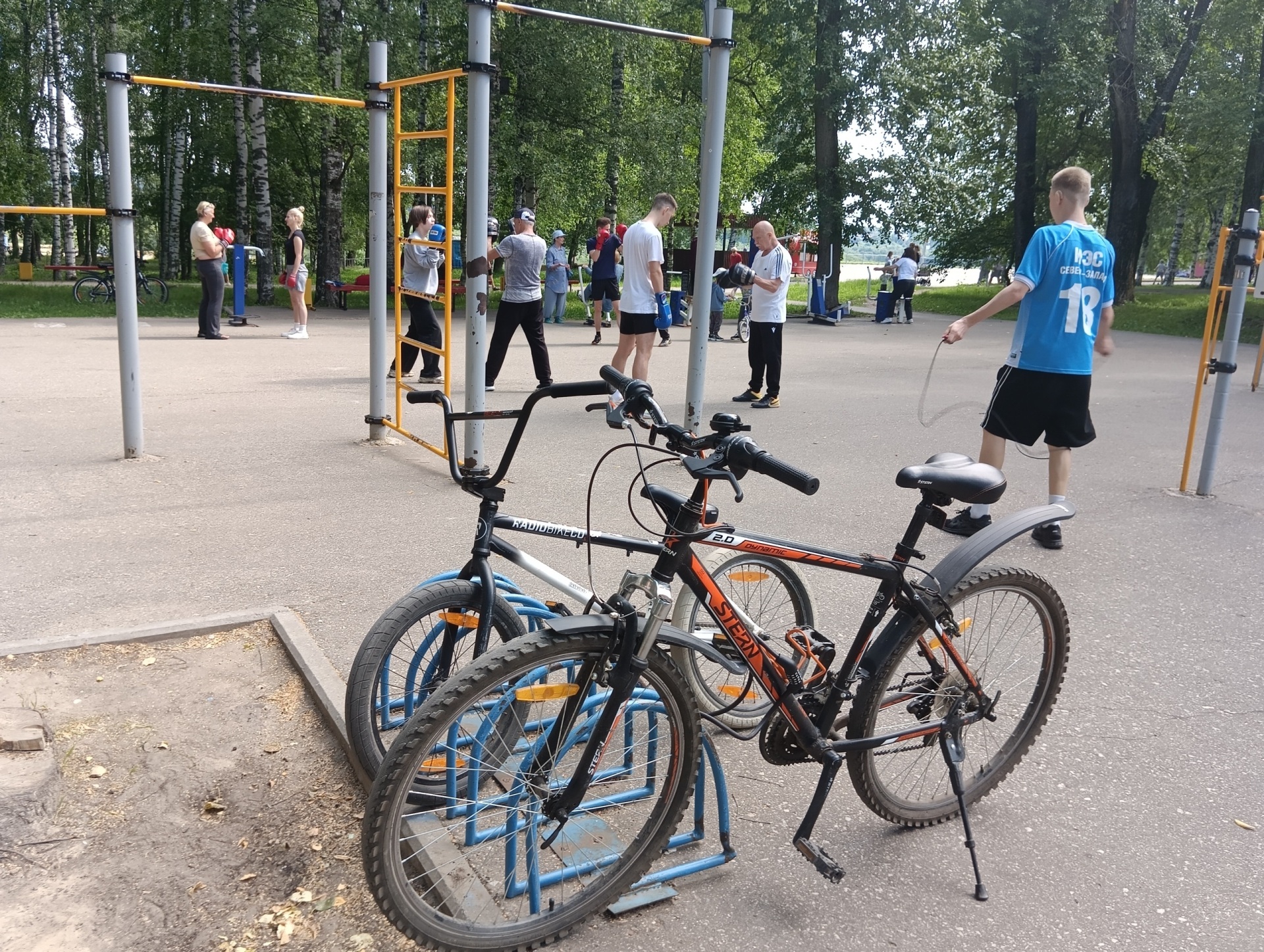 На бетонном основании установлены гимнастические скамьи, перекладины различной высоты, комплексы для прыжков и силовых упражнений, а также специальные брусья для занятий людей с ограниченными возможностями здоровья.