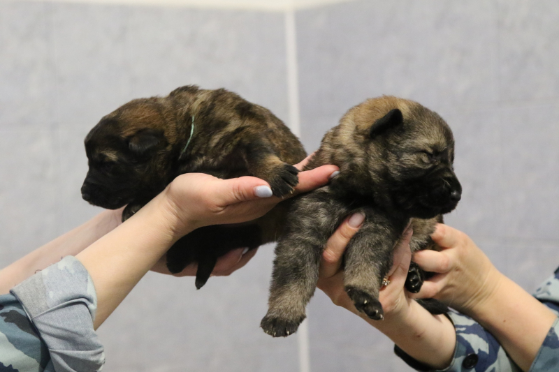 Немецкая овчарка Воля, подготовленная для поиска взрывчатых веществ, родила восьмерых щенков, а бельгийская овчарка Еоланта, работающая на поиск наркотиков - четырех.
