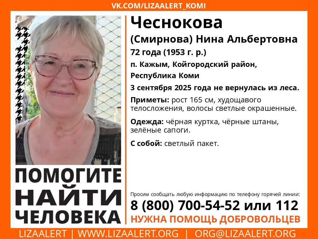 Нина Чеснокова ушла в лес в районе п.Кажим и не вернулась.