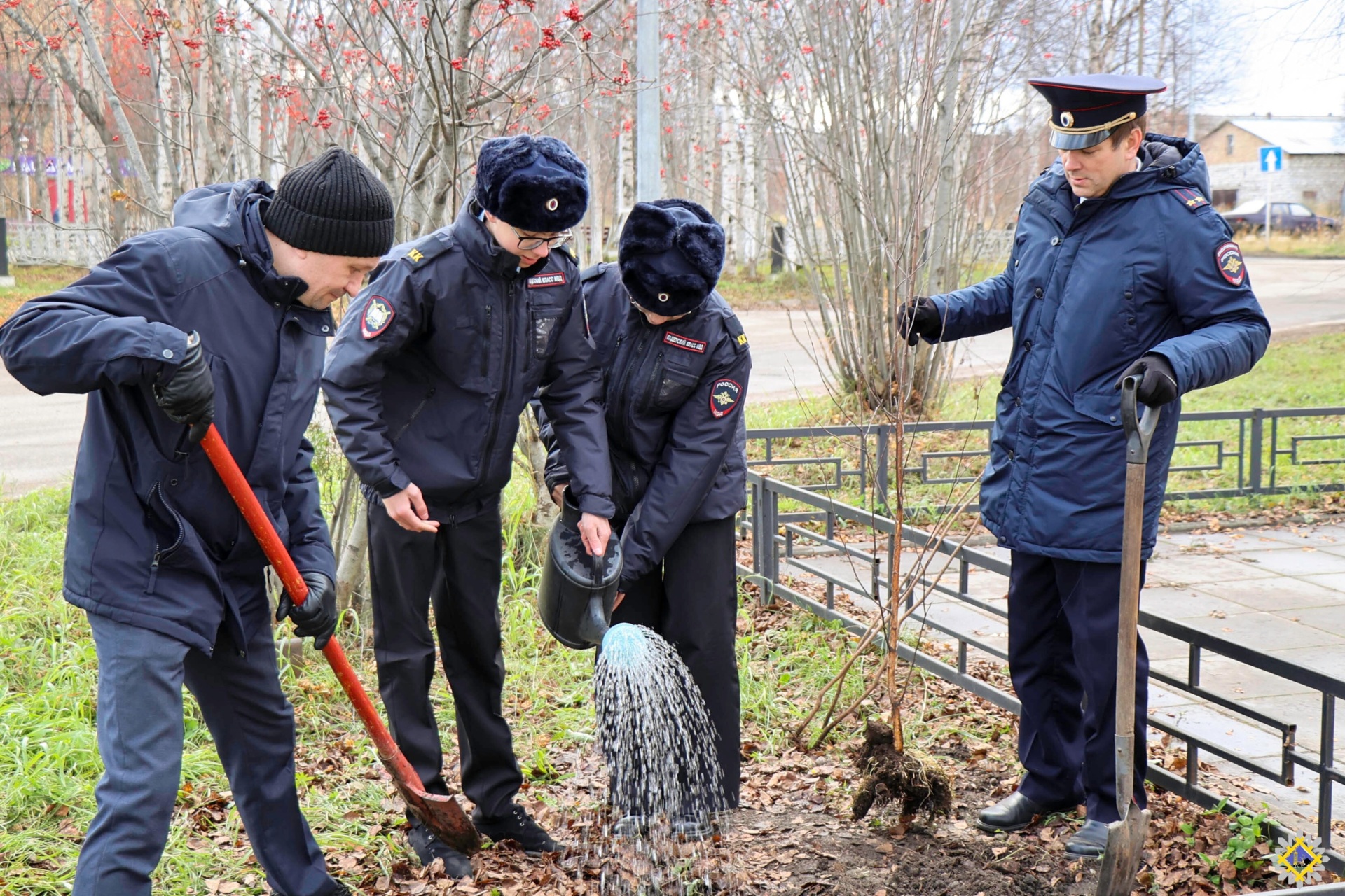 В Инте кадеты и сотрудники полиции высадили деревья в сквере имени Сергея Кулешова